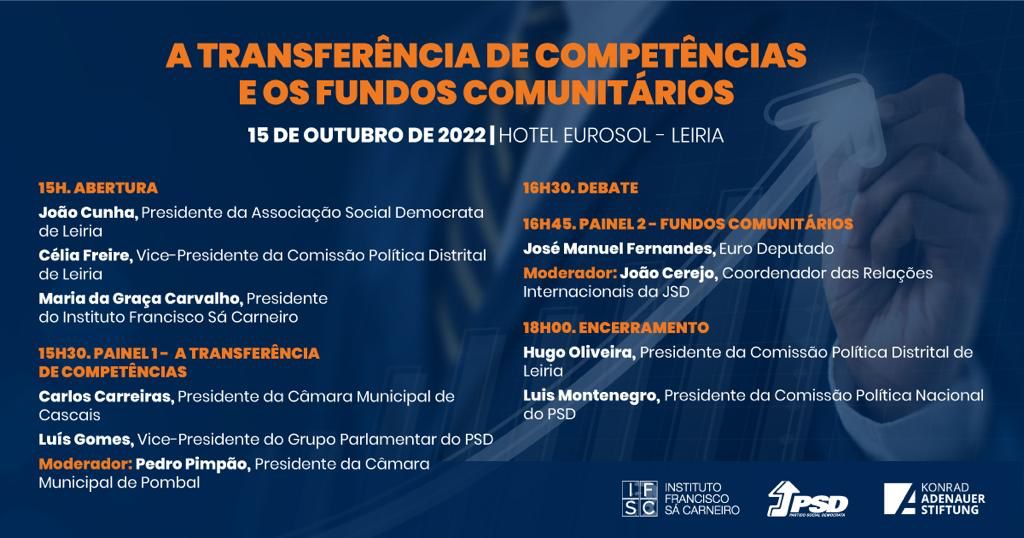 No próximo dia 15 de outubro o Instituto Francisco Sá Carneiro em associação com o PSD Distrital de Leiria dinamizam a conferência "A transferência de Competências e os Fundos Comunitários".