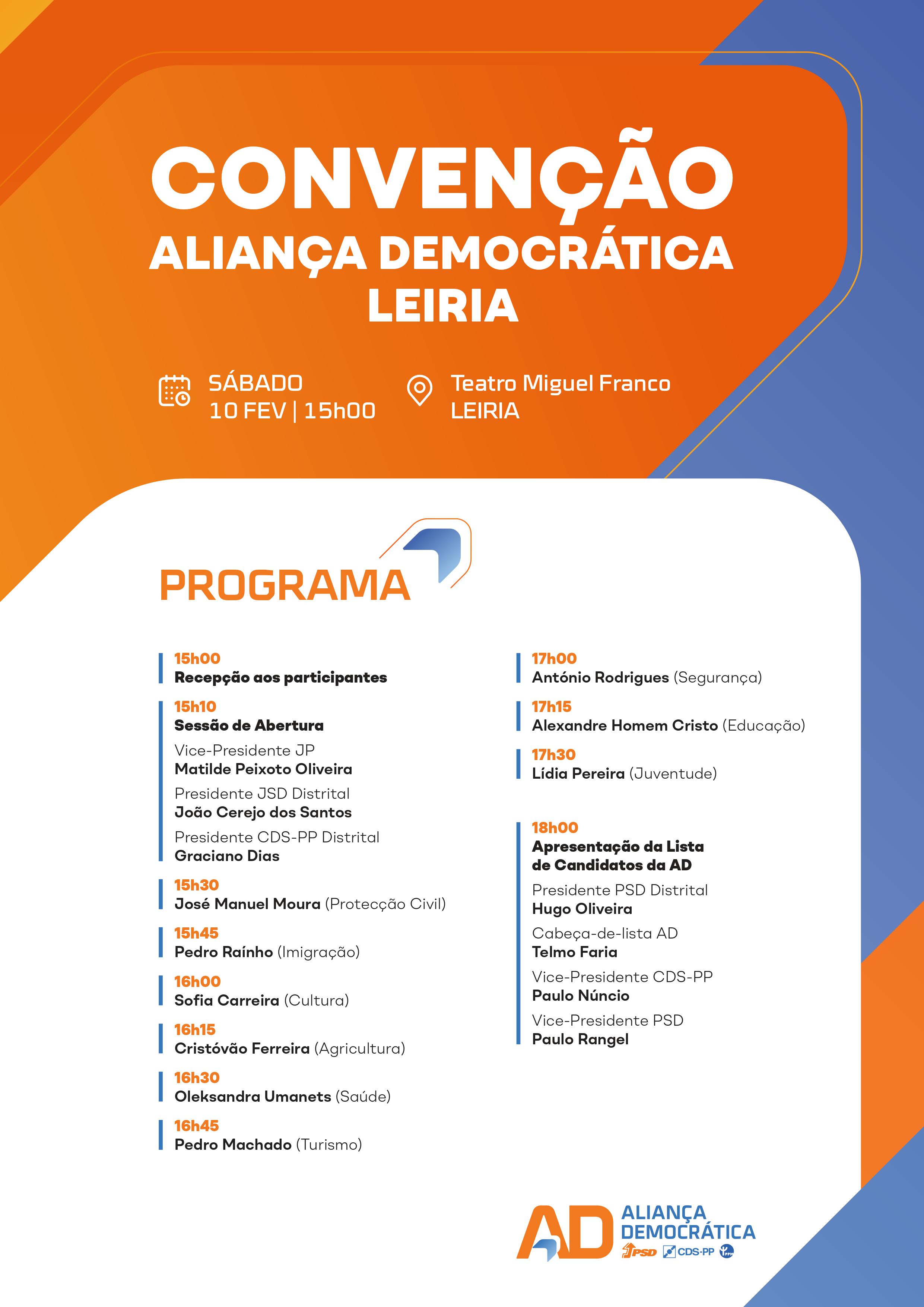 Dê o seu apoio à Aliança Democrática marcando presença na Convenção da AD/Leiria e Apresentação da lista de candidatos da AD pelo Círculo Eleitoral de Leiria, no próximo sábado, dia 10 de fevereiro, entre as 15h e as 18h, no Teatro Miguel Franco em Leiria.